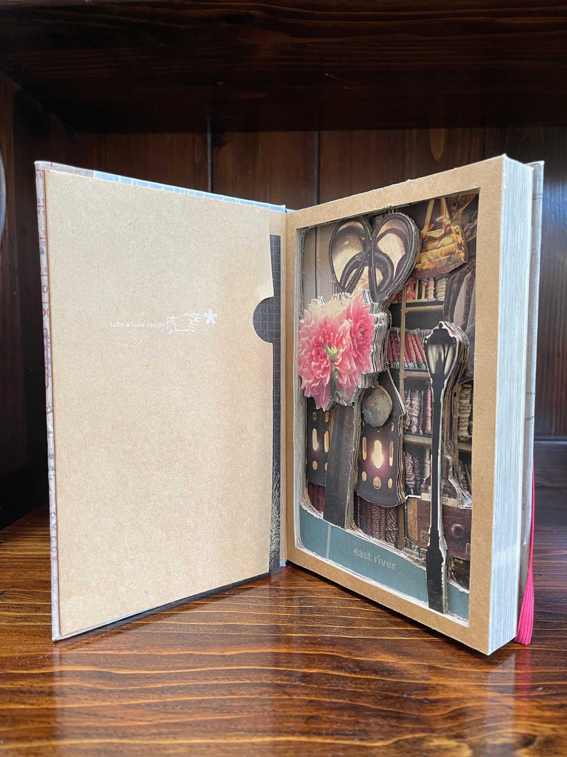 This book carving is completely one of a kind. I will not repeat images. What you see are the actual pages in the book. My process is to take away pages or portions of pages. This is all done by hand...xacto blades, tweezer and my glasses.